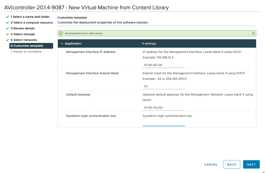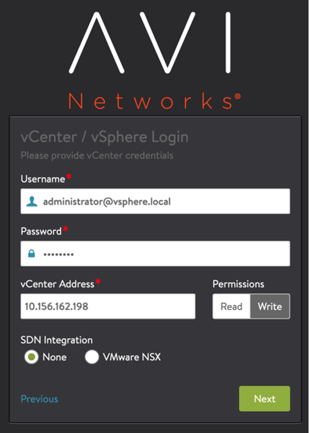 The appliance needs to know how to connect to your vCenter. Supply the username, password and vCenter information so that ALB can connect to vCenter. For permissions, you can leave “Write” selected, as this will allow for easier deployment and automation between ALB and vCenter. Leave SDN Integration set to “None”.