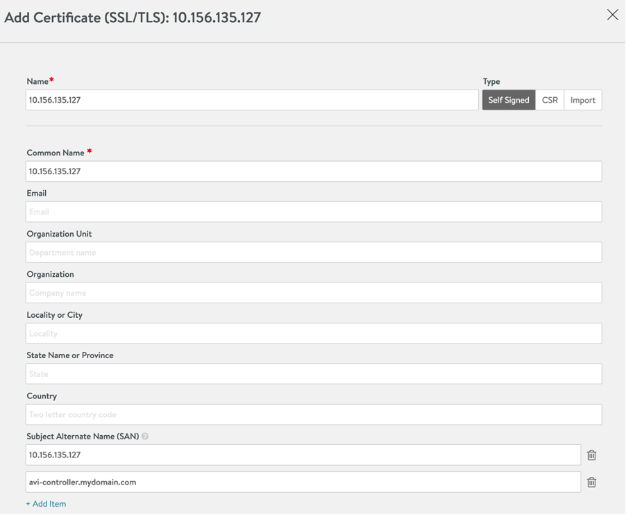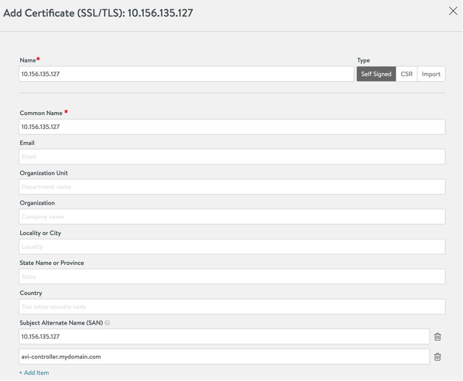 Create a self-signed certificate by providing the required information. Make sure to add Subject Alternate Name(s).
