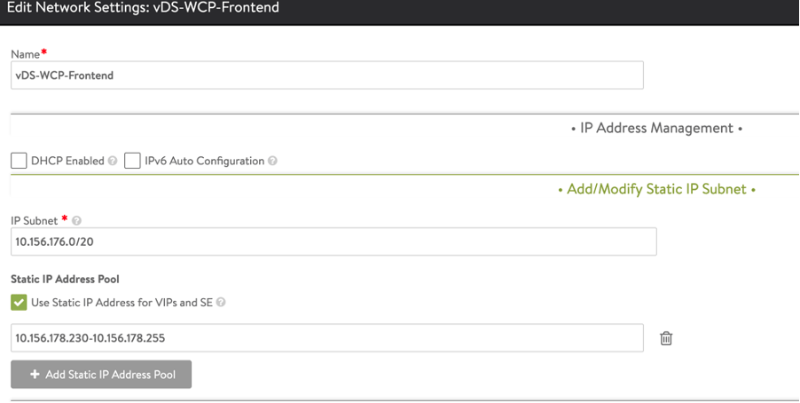 Select the Port Group for the data network, specify an IP address, and add a static IP address pool to be used.