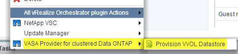 Now that the SCP is created, we can provision a VVol Datastore. Right click on the cluster or host and select “VASA Provider for clustered Date ONTAP”, then Provision VVol datastore.
