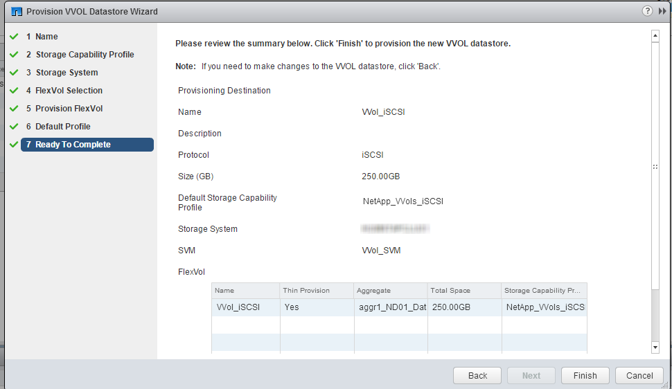 Start the wizard and type the name of the VVol datastore, and select the desired protocol. Select the SCP that you want to include within the VVol, the qualified SVM(s) will be available if it matches the SCP you selected. For example, if you selected the SCP/protocol that calls for iSCSI and you only have one iSCSI SVM, that will be the only one that you will have as an option, and the NFS or FCP/FCoE SVMs will not appear. If there is a qualified volume, you may select to use it, or you may select none to create a new. If creating a new vol, choose the name, SCP, and other options just like you would from NetApp’s System Manager. You will also have the capability to add/create more volumes to the VVol datastore. The last step is to select a default SCP the VMs will use if the do not have a VMware profile assigned to them.